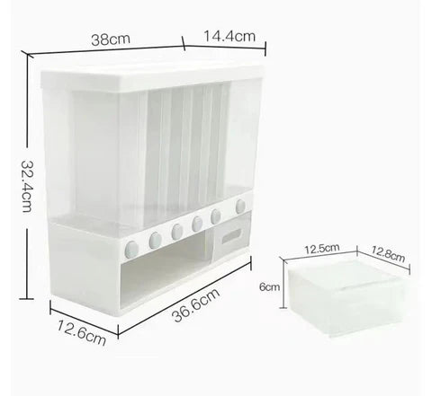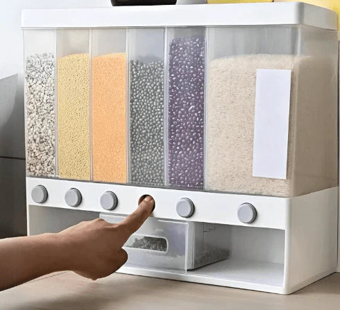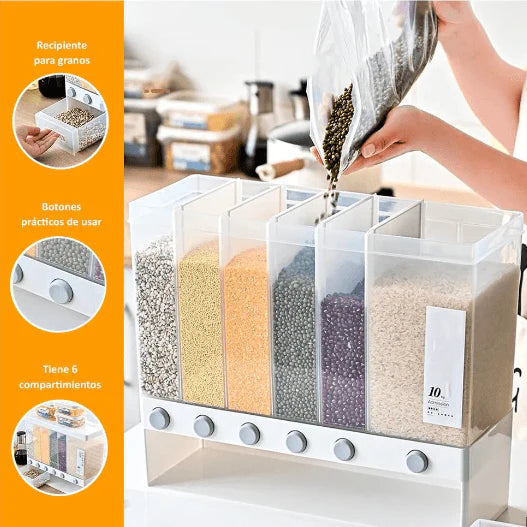 • 6 secciones de diferentes tamaños para almacenar los tipos de alimentos secos más utilizados